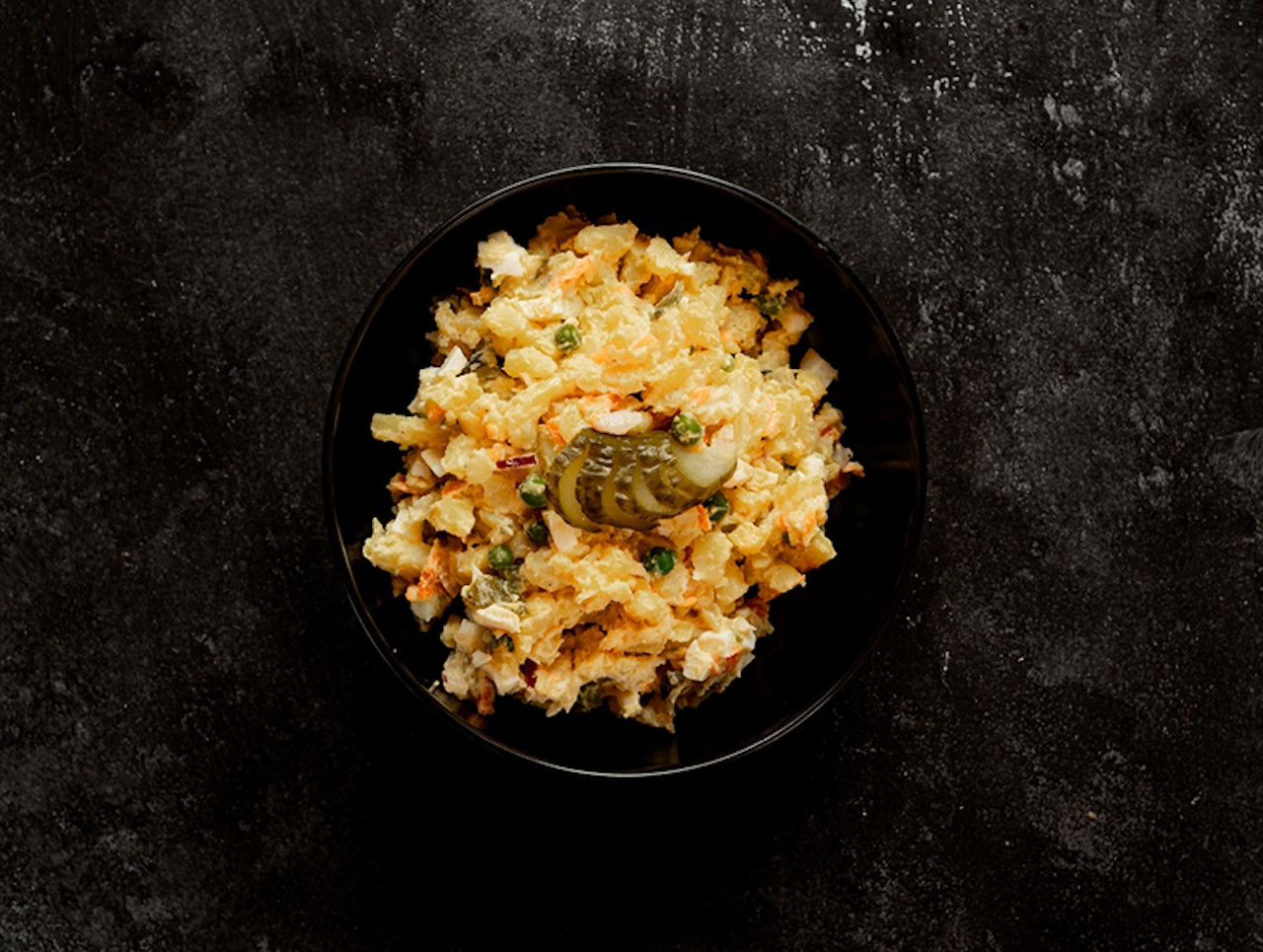 Poctivá česká klasika, která nesmí chybět na žádné oslavě ani svátečním stole. Připravujeme jej z vařených brambor ve slupce, vajec, hrášku, mrkve a nakládaných okurek. Chuť krásně propojí jemná majonéza s hořčicí, která dodá salátu plnost a typický charakter.