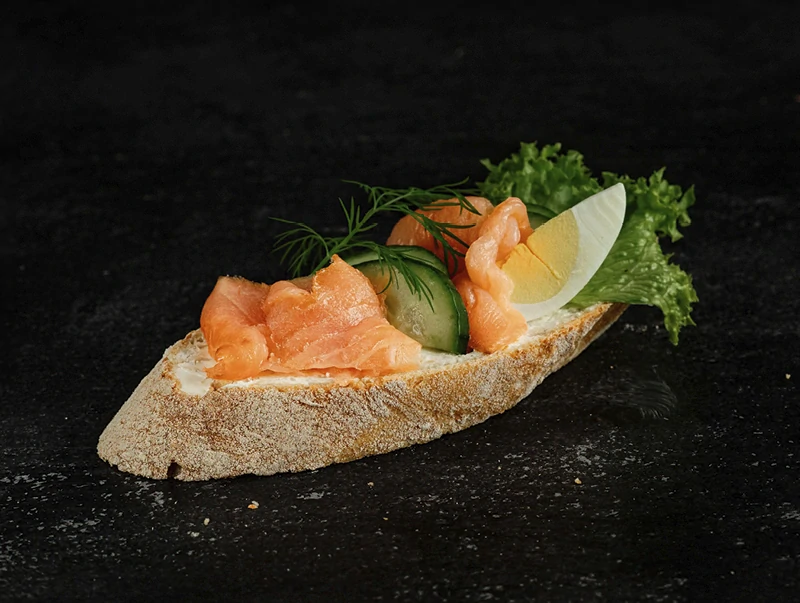 Lososový chlebíček je elegantní a lehká delikatesa pro milovníky rybích chutí. Na křupavé ciabattě jemně potírané máslem servírujeme kvalitní uzený losos, doplněný snítkou čerstvého kopru pro výraznější aroma. Dozdobený okurkou, vajíčkem a salátem působí svěže, harmonicky a na oko opravdu lákavě.