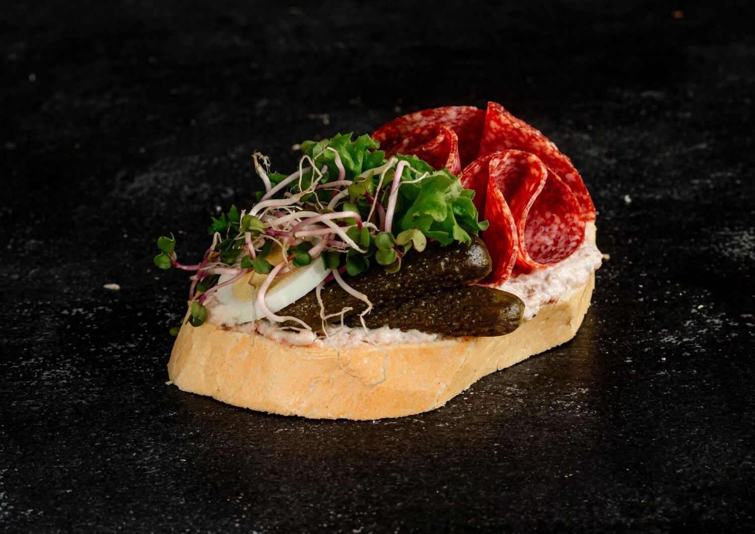 Poctivý chlebíček pro milovníky výrazných chutí. Plátek čerstvé veky je mazaný salámovou pomazánkou a bohatě zdobený plátky voňavého salámu Herkules, nakládanou okurkou, vajíčkem, klíčky a listem salátu.