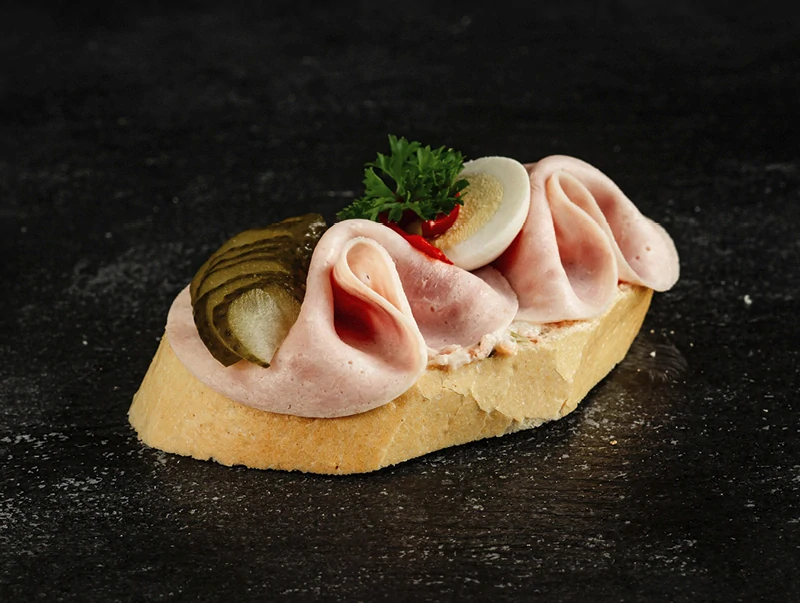 Náš nejprodávanější šunkový chlebíček — poctivá česká klasika, která nikdy nezklame. Na tradiční vece s chlebíčkovým salátem Váhala pokládáme kvalitní plátek dušené šunky, doplněný vajíčkem, sterilovanou okurkou a kouskem papriky pro svěží kontrast.