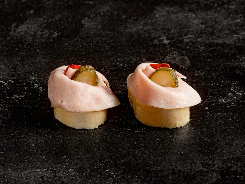Šunková jednohubka je oblíbená klasika, která se skvěle hodí na rodinné oslavy, firemní akce i přátelská posezení. Na francouzské světlé bagetce podáváme chlebíčkový salát, který dodává jemnou a lahodnou chuť. Jednohubka dozdobená kvalitní dušenou šunkou Váhala, vajíčkem, kapií a nakládanou okurkou, působí svěže, barevně a dokonale vyváženě.