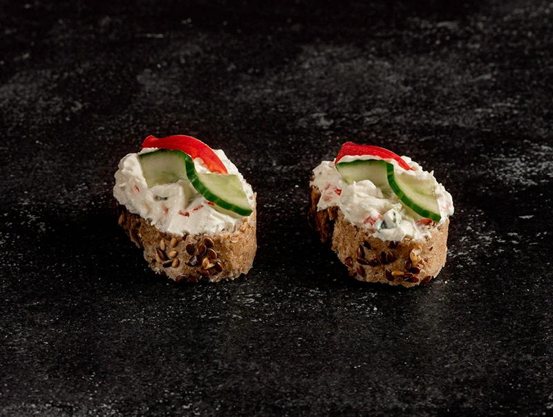 Zeleninová jednohubka je malá, svěží a lehká chuťovka, která se skvěle hodí na rodinné oslavy, firemní akce i přátelská setkání. Na kornové tmavé bagetce roztíráme jemnou pomazánku z Lučiny s paprikou a salátovou okurkou, která dodává příjemně krémovou a lehkou chuť. Dozdobená okurkou a kapií působí krásně barevně a svěže.