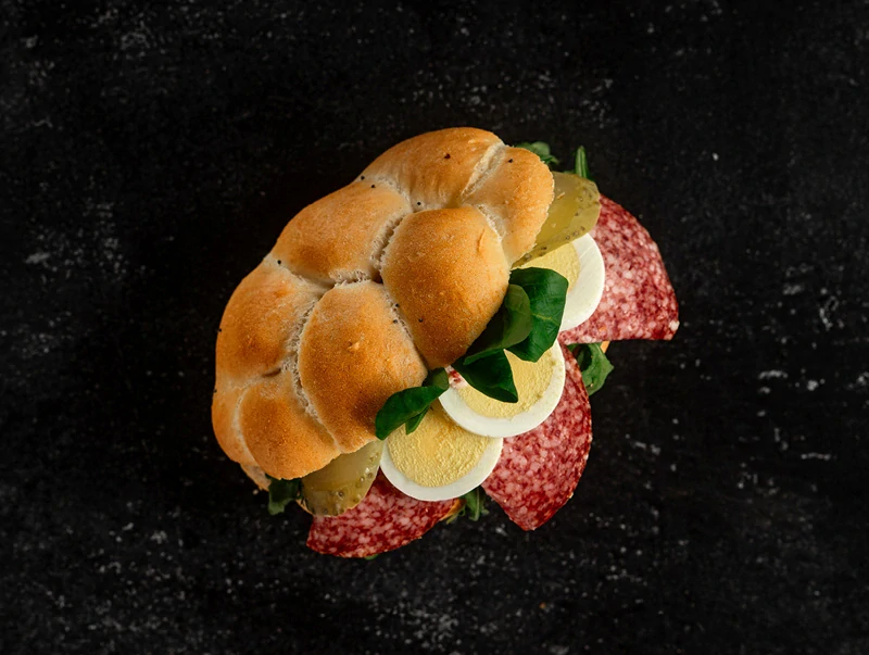 Čerstvá tanvaldská houska je plněná salámovou pomazánkou, salámem Herkules, vařeným vajíčkem, nakládanou okurkou a polníčkem. Jednoduchá kombinace, která nikdy nezklame.