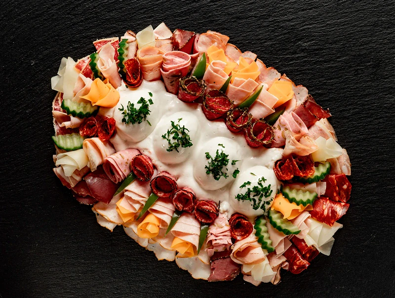 Obložená mísa se salátem (8 porcí, cca 160 dkg) je připravena z pečlivě vybraných, bezlepkových uzenin firmy Váhala, doplněných o náš chlebíčkový salát, kvalitní sýr a majonézový přeliv přes vajíčka. Vzniká tak bohatá, chutná a vizuálně atraktivní mísa, která se skvěle hodí na rodinné oslavy, firemní akce i přátelská setkání.